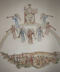 An der gegenüberliegenden Wand hat der Ostberliner Künstler Gerhard Olbrich, ein Schüler des Schweizer Meisters Willy Fries, dem Nachdenken über Tod und über das Jüngste Gericht einen bildhaften Ausdruck gegeben. Nach Johann Peter Hebels "Gespräch über die Vergänglichkeit" ist, verbunden mit der Visionen aus der Offenbarung des Johannes in Kapitel 1 und 4, eine Bildkomposition an die helle Wand gemalt worden.