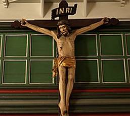 Ein Kruzifix hängt seit 1943 an der Orgelempore. Es wurde als Dankgeschenk unserer Gemeinde vermacht.