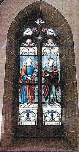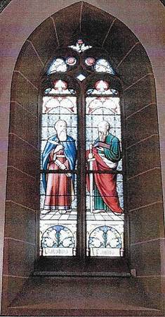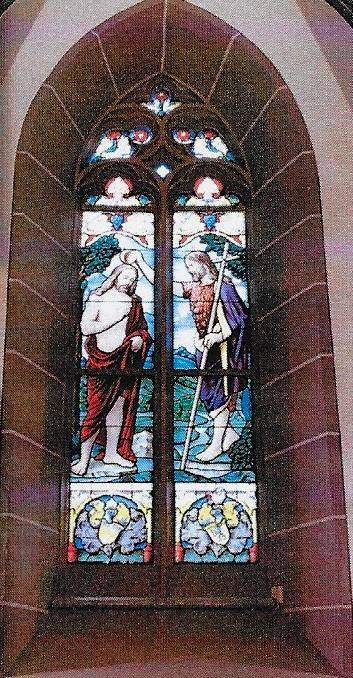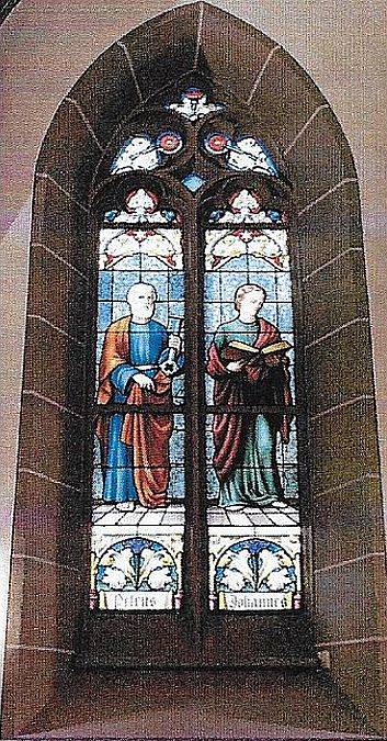 Die drei Fenster im Chorraum sind erst auf Kosten der Fabrikantenfamilie Großmann mit den leuchtenden Glasmalereien versehen worden. Hans Drenckhahn aus Basel schuf sie im Jahre 1905. Je eine Zweiergruppe der bedeutendsten Apostel, Paulus und Petrus zur linken und Johannes und Jakobus zur rechten Seite schließen eine Bildkomposition in der Mitte ein. Diese stellt Johannes den Täufer und Jesus bei dessen Taufe am Jordan dar. Die Apostel auf dem rechten und linken Fenster sind Nachbildungen der „vier Apostel“, wie sie der große Nürnberger Maler Albrecht Dürer geschaffen hatte. An der geraden Südseite des sieben Meter langen Chors befindet sie noch ein mit hellem Glas versehenes Bogenfenster, das dem Raum mehr Licht verschafft.