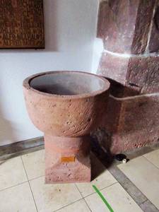 Der alte romanische Taufstein stammt aus dem 14.Jhd. oder ist vielleicht noch älter, da er in seiner Form auf die Zeit der Ganzkörpertaufe zurückweist.